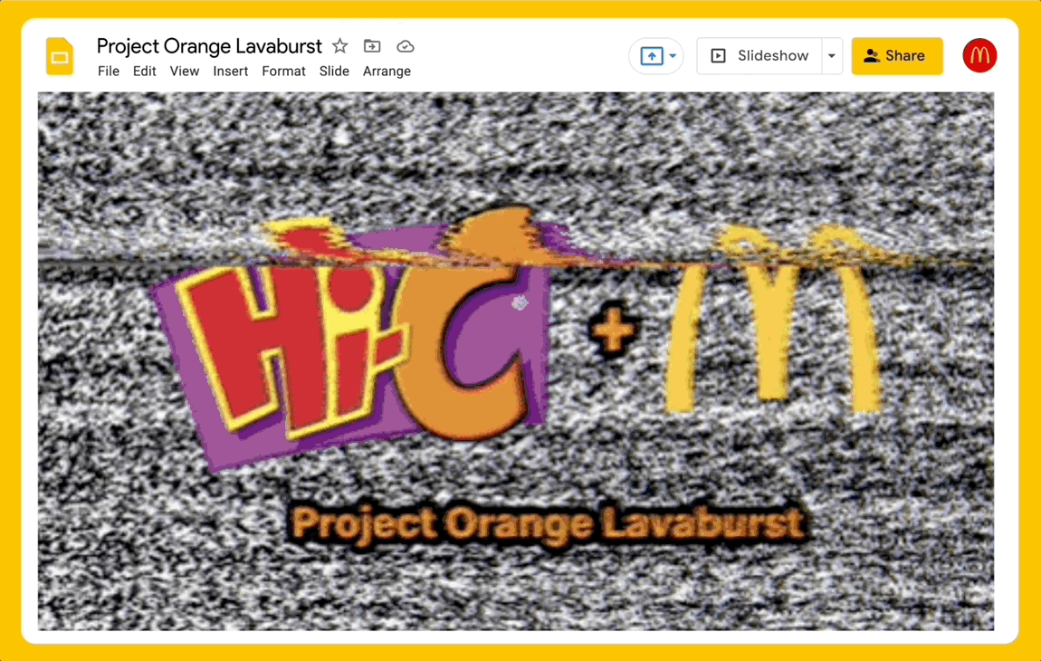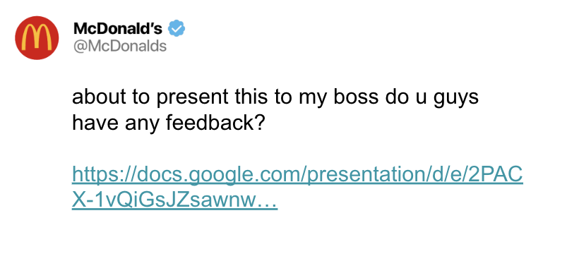 instead of simply delivering the news, we told a story about the @mcdonalds admin lobbying executives on behalf of Hi-C’s fans, by sharing their unhinged pitch deck as a public google slides document. Fans were invited to leave feedback as comments directly in the doc before it went to the “VP of beverages.”
