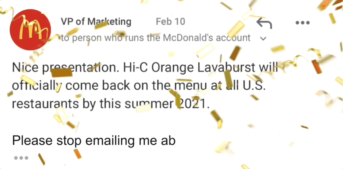 In 2021, we found out that McDonald’s would return a fan-favorite from the 90s to its drink menu: Hi-C Orange Lavaburst, and were asked to create a post that shares the news with fans in a splashy way.